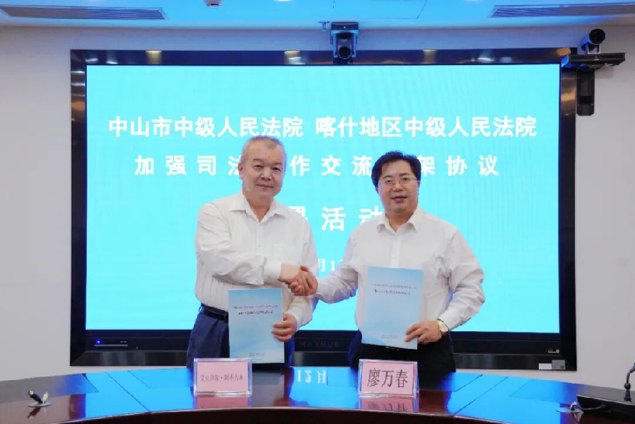 為推進對口援疆工作向縱深發(fā)展,12月1日,廣東省中山市中級人民法院與新疆維吾爾自治區(qū)喀什地區(qū)中級人民法院簽訂《加強司法協(xié)作交流框架協(xié)議》。此次簽約以“互相借鑒、資源共享、協(xié)同創(chuàng)新、共同發(fā)展”為原則,標(biāo)志著兩地法院司法協(xié)作邁入常態(tài)化、制度化新階段??κ仓性狐h組副書記、院長艾克拜爾·阿不力木,中山中院黨組書記、院長廖萬春作為代表簽署協(xié)議。