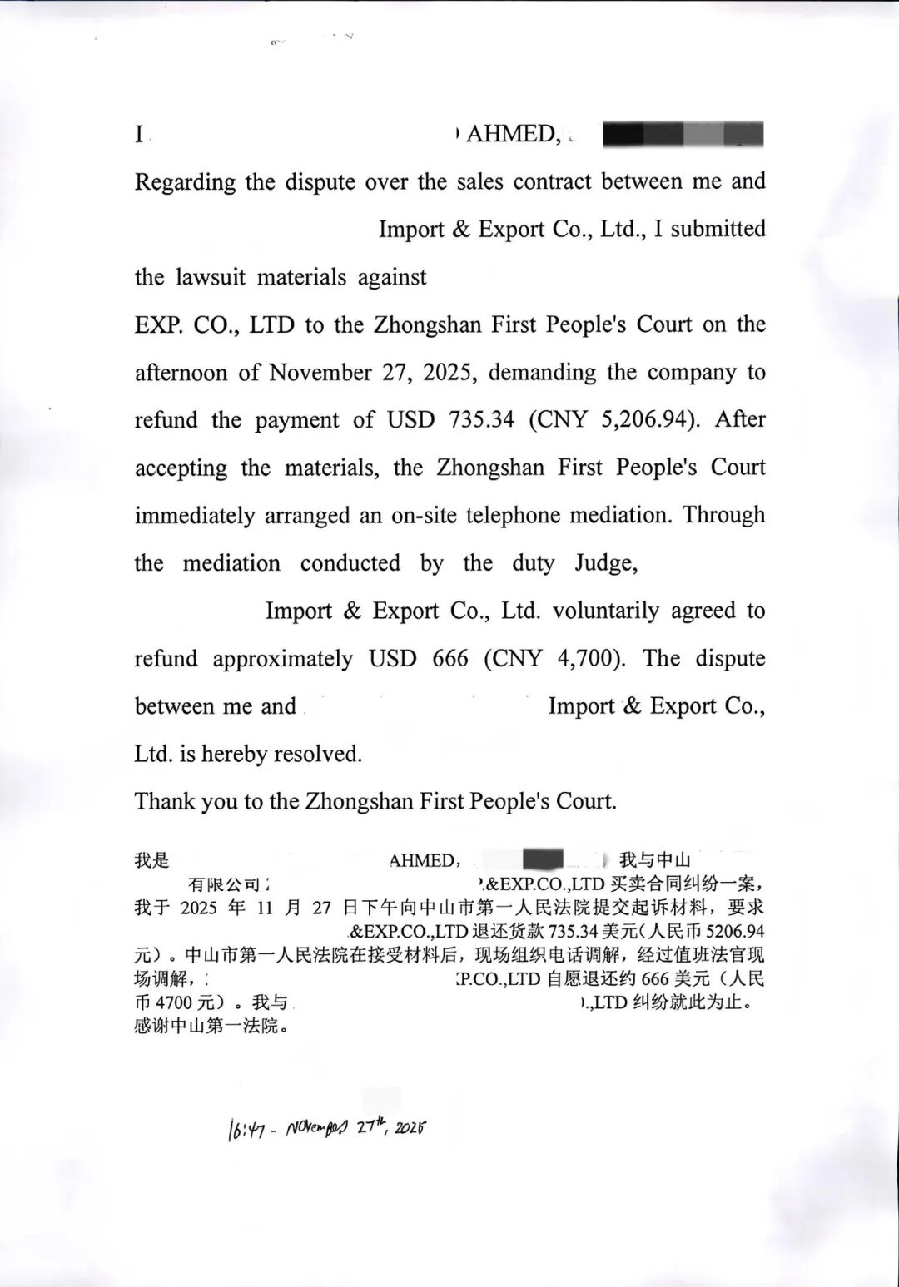 起因:一筆貨款起爭議,溝通無果陷僵局 今年9月,在浙江經商的阿麥德通過微信與中山某進出口公司銷售經理謝先生達成采購意向,并于10月正式簽訂總價29438.55美元的合同,阿麥德依約支付了全款。 然而,在合同履行過程中,雙方因產品及出口包裝問題產生分歧,最終決定解除合約。中山某公司先行退還了大部分貨款,但剩余735.34美元應否退還、如何計算,雙方始終無法達成一致。 阿麥德認為,因產品無法交付,貨款應全額退還。中山某公司則主張產品均可交付,是對方要求的包裝不符合報關要求導致解約,因此需扣除部分成本,余款不予退還。多次協(xié)商未果后,雙方陷入僵局。 解紛:走進法院求幫助,法官現(xiàn)場促調解 隨后,阿麥德在朋友建議下,來到中山法院訴訟服務中心。現(xiàn)場導訴員和窗口工作人員引導阿麥德的朋友協(xié)助填寫要素式起訴狀,并準備訴訟材料。值班法官高昊振與阿麥德現(xiàn)場交流,了解案件情況。在得知案件標的額不大且雙方爭議明確后,高昊振法官征得阿麥德同意,現(xiàn)場與中山某公司的謝先生電話聯(lián)系,爭取在前端化解矛盾糾紛。 高法官在電話中細致梳理爭議焦點,從訴訟成本、法律規(guī)定等角度與謝先生反復溝通,同時也對阿麥德釋明訴訟風險。最終謝先生同意再退600美元以了結糾紛。不過,阿麥德仍堅持對方應承擔其維權成本,要求全額退款。 破局:耐心釋法促共識,15分鐘化干戈 面對雙方的不同意見,高昊振法官現(xiàn)場與阿麥德耐心交流,同時向阿麥德同行的朋友詳細解釋法律規(guī)定。好友在深入了解了阿麥德的真實想法后,結合法官的意見,說服阿麥德放下芥蒂,爭取以和解促共識。阿麥德最終同意做出部分讓步。 高昊振法官現(xiàn)場撥通了謝先生的電話,經過一番溝通,雙方均認可高昊振法官提出的現(xiàn)場退還666美元的和解方案。在法官的見證下,謝先生依照當日匯率,通過微信退還了人民幣4200元,阿麥德隨即出具了和解文書并對法院干警表示感謝。