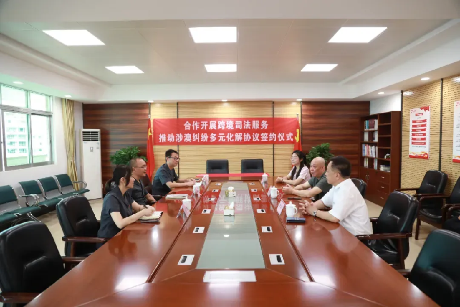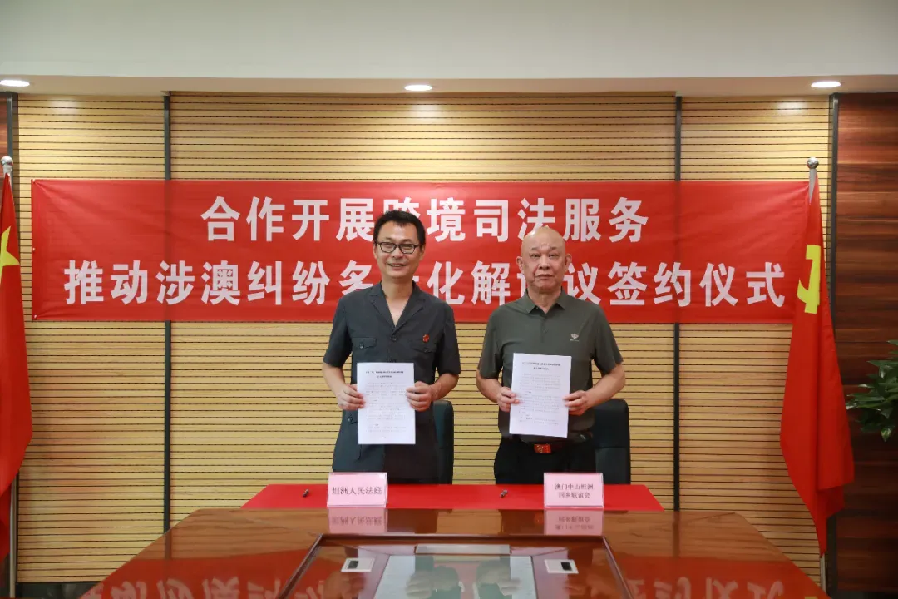▲合作協(xié)議簽約儀式 5月30日,市第一法院坦洲法庭、澳門同鄉(xiāng)會、坦洲鎮(zhèn)僑聯(lián)召開合作共建工作會議。會上,坦洲法庭與澳門同鄉(xiāng)會共同簽訂了《以高質量司法服務推動涉澳糾紛多元化解的協(xié)議》,明確“坦澳相融”機制的工作宗旨為:“深化聯(lián)動,協(xié)同互助,同鄉(xiāng)社團充分發(fā)揮地緣、人脈優(yōu)勢,在人民法庭訴訟程序、解紛等方面提供協(xié)助支持。法庭利用專業(yè)優(yōu)勢為社團成員提供更加便捷、優(yōu)質的司法服務,實現(xiàn)效能疊加和良性互動。加強澳門居民對內地司法的認同感,尋求最優(yōu)化解涉澳當事人的矛盾糾紛路徑,最大化保護涉澳糾紛當事人的合法權益,助推粵港澳大灣區(qū)涉外法治建設高質量發(fā)展?!?/span>