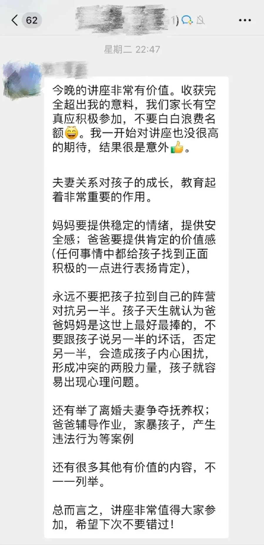 “今晚的講座非常有價值!” “夫妻關系對孩子的成長,教育起著非常重要的作用!” 2024年10月22日晚,中山市南區(qū)竹秀園中心小學邀請中山市中級人民法院民一庭家事審判團隊為學生家長舉辦了一場以“讓愛流動,法育苗圃”為主題的家庭教育培訓講座。在聆聽法官的深入淺出的精彩講述和面對面交流后,家長們由衷地感慨道。