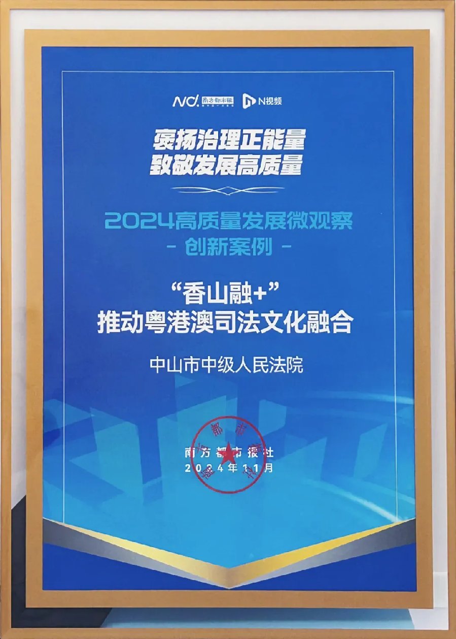 11月29日,由南方報(bào)業(yè)傳媒集團(tuán)指導(dǎo),南方都市報(bào)社、N視頻主辦的“褒揚(yáng)治理正能量,致敬發(fā)展高質(zhì)量”2024高質(zhì)量發(fā)展微觀察優(yōu)秀案例展示會(huì)在廣州白云國(guó)際會(huì)議中心隆重舉行。會(huì)議發(fā)布了《2024高質(zhì)量發(fā)展微觀察調(diào)研報(bào)告》,來(lái)自全國(guó)政界、學(xué)界、商界的上百名代表參會(huì),現(xiàn)場(chǎng)對(duì)珠三角各城的高質(zhì)量發(fā)展微觀察優(yōu)秀案例進(jìn)行集中展示、表彰。其中,中山市中級(jí)人民法院打造的“香山融+”粵港澳司法文化融合項(xiàng)目入選“2024高質(zhì)量發(fā)展微觀察”9大創(chuàng)新案例。