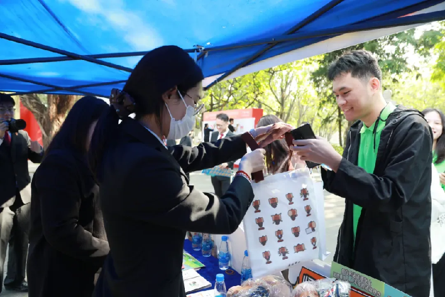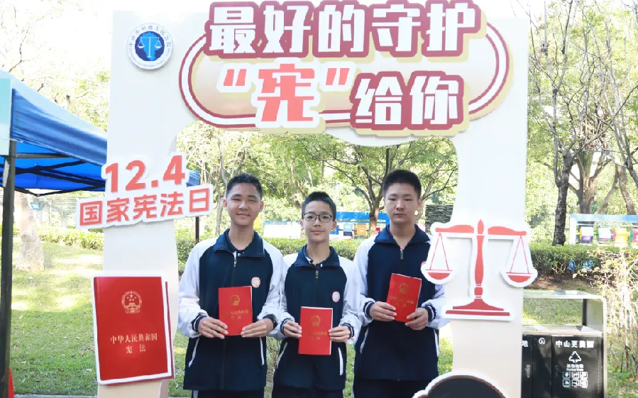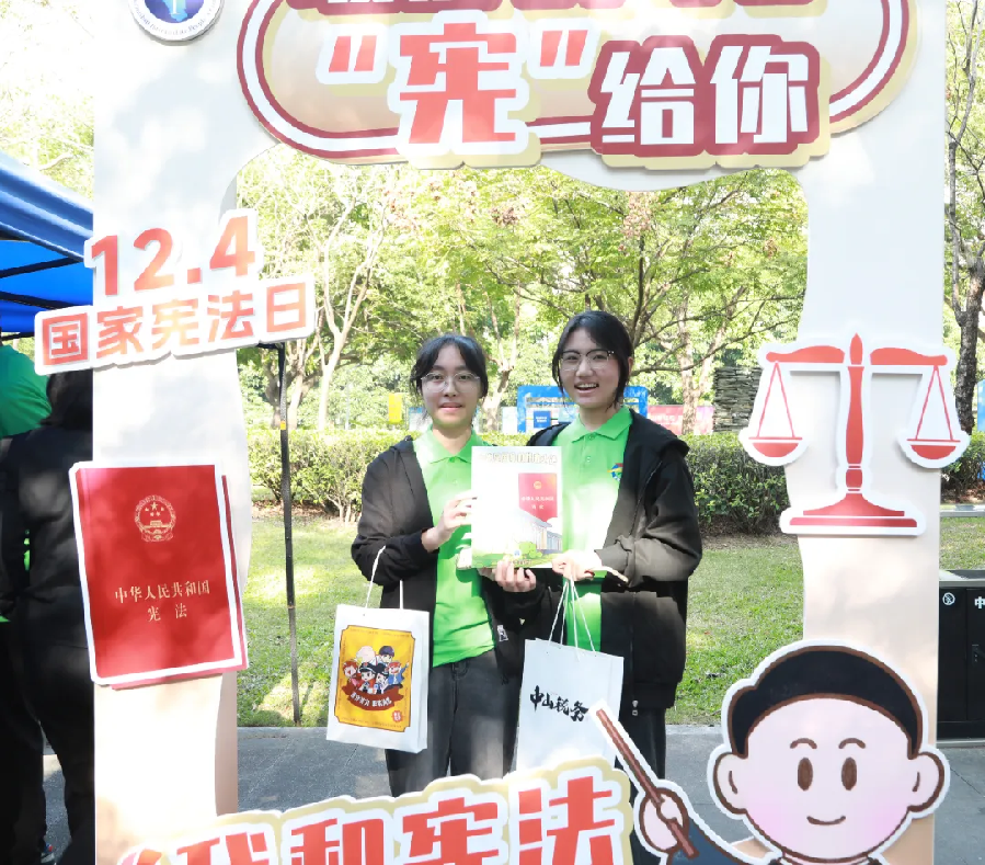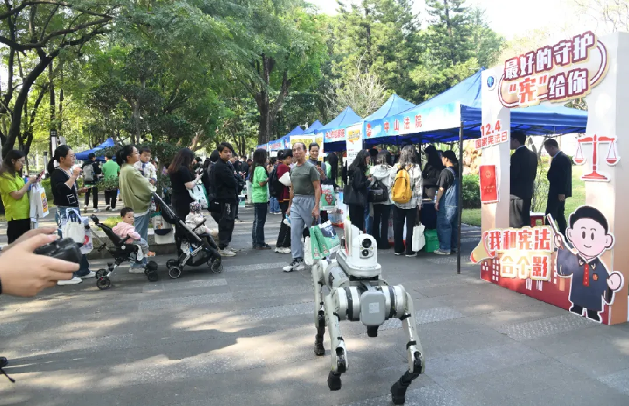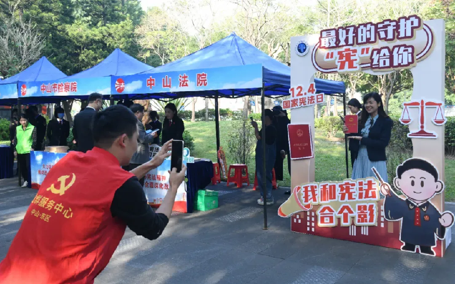 憲法是國家的根本法,是黨和人民意志的集中體現(xiàn),具有最高的法律地位、法律權(quán)威、法律效力。12月4日,我們迎來了第十一個國家憲法日。中山法院開展了豐富多彩的憲法宣傳活動,弘揚社會主義法治精神,為群眾送來干活滿滿的憲法“大禮包”。 “我和憲法合個影” 12月4日上午,在陽光明媚的中山市法治文化公園,中山兩級法院干警開展了和市民群眾“面對面”“零距離”的憲法宣傳普法活動。身上立著憲法宣傳知識的高科技“機器狗”來助陣。精心設(shè)計的“我和憲法合個影”打卡點引來市民紛紛駐足,和憲法“同框”。現(xiàn)場還展示了中山法院特色普法文創(chuàng)IP“鐘小法”“法小槌”系列展品,憲法知識書簽、海報、文創(chuàng)手袋、動漫公仔應有盡有……市民朋友們踴躍加入到法律知識問答活動中來,在寓教于樂中收獲了滿滿的憲法法律知識。