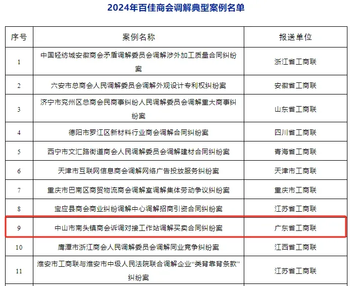 近日,全國工商聯(lián)辦公廳通報(bào)“2024年百佳商會(huì)調(diào)解典型案例”評選結(jié)果,中山市第二人民法院與南頭鎮(zhèn)工商聯(lián)(商會(huì))訴調(diào)對接工作站、商事巡回法庭選送的《“法院+商會(huì)”共建機(jī)制