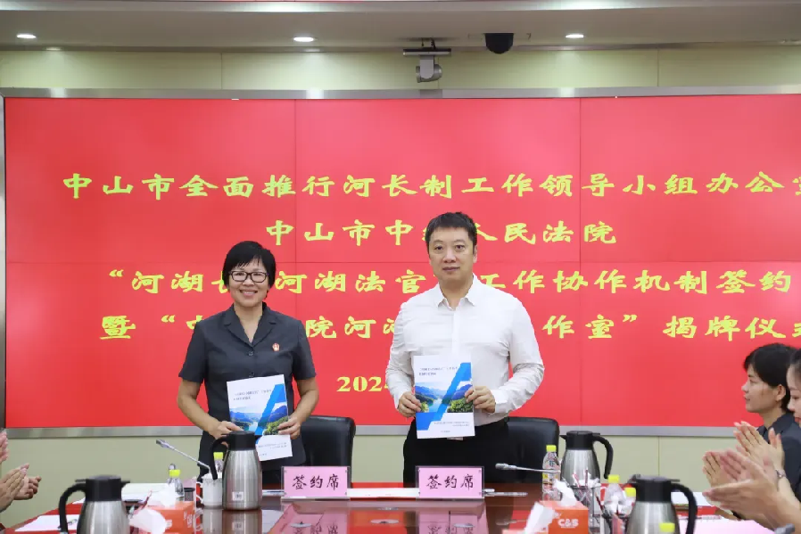 ▲中山市中級人民法院與中山市河長辦舉行《“河湖長+河湖法官”工作協(xié)作機制共建協(xié)議》簽約暨“中山法院河湖法官工作室”揭牌儀式。 中山市中級人民法院黨組成員、副院長李桂蘭介紹,根據(jù)今年5月簽訂的《中山市全面推行河長制工作領導小組辦公室