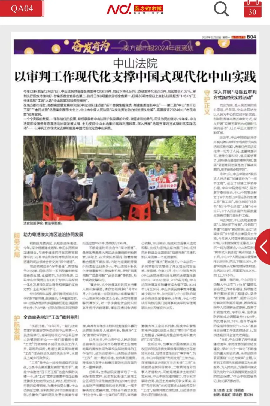 12月30日,新的一年來臨之際,南方都市報整版報道回望2024年,中山法院以審判工作現(xiàn)代化支撐中國式現(xiàn)代化中山實踐的亮點工作。