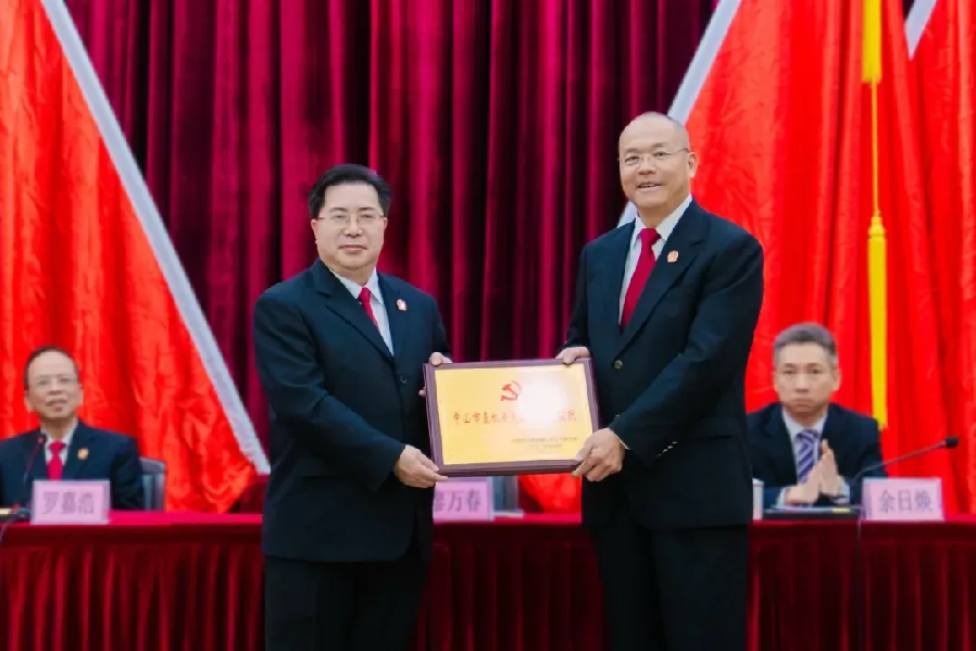 ▲廖萬(wàn)春院長(zhǎng)為民六庭黨支部頒發(fā)中山市直機(jī)關(guān)先進(jìn)基層黨組織獎(jiǎng)牌和證書(shū)。