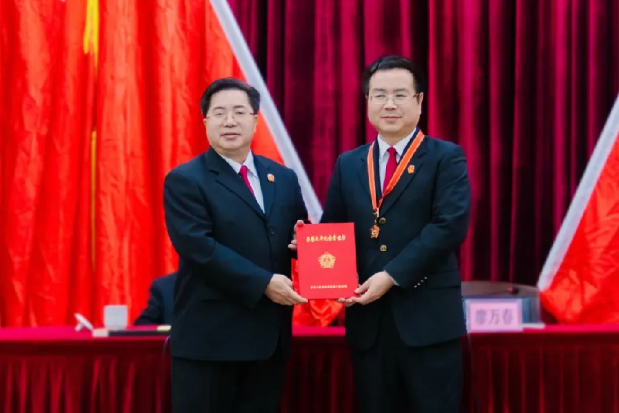 ▲廖萬(wàn)春院長(zhǎng)為雷勇同志頒發(fā)榮譽(yù)天平紀(jì)念章。