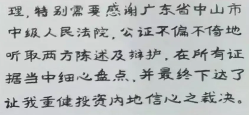 “感謝廣東省中山市中級(jí)人民法院,讓我對(duì)投資內(nèi)地更加放心,也讓我更加堅(jiān)定了我要在內(nèi)地持續(xù)發(fā)展的信心!”近日,潘女士向中山市中級(jí)人民法院寄來(lái)感謝信,“內(nèi)地健全的法律制度保護(hù)了市民的合法權(quán)益,我要為法官和工作人員點(diǎn)贊!”在信中她感慨地說(shuō)道。