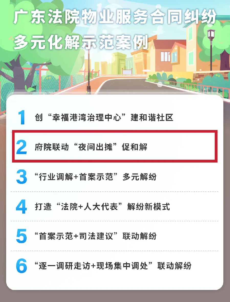 此次一共發(fā)布6個案例,中山市第一人民法院坦洲法庭的《府院聯(lián)動“夜間出攤”促和解》案例入選其中。在這個案件中,法院啟動“法庭+綜治+城建”工作機制,多方聯(lián)合開展物業(yè)糾紛治理專項行動,共同派出27名工作人員前往小區(qū)“擺攤設(shè)點”,傾聽業(yè)主意見,釋法答疑,大部分業(yè)主交納了物業(yè)費,物業(yè)公司也撤回了起訴,取得良好效果。