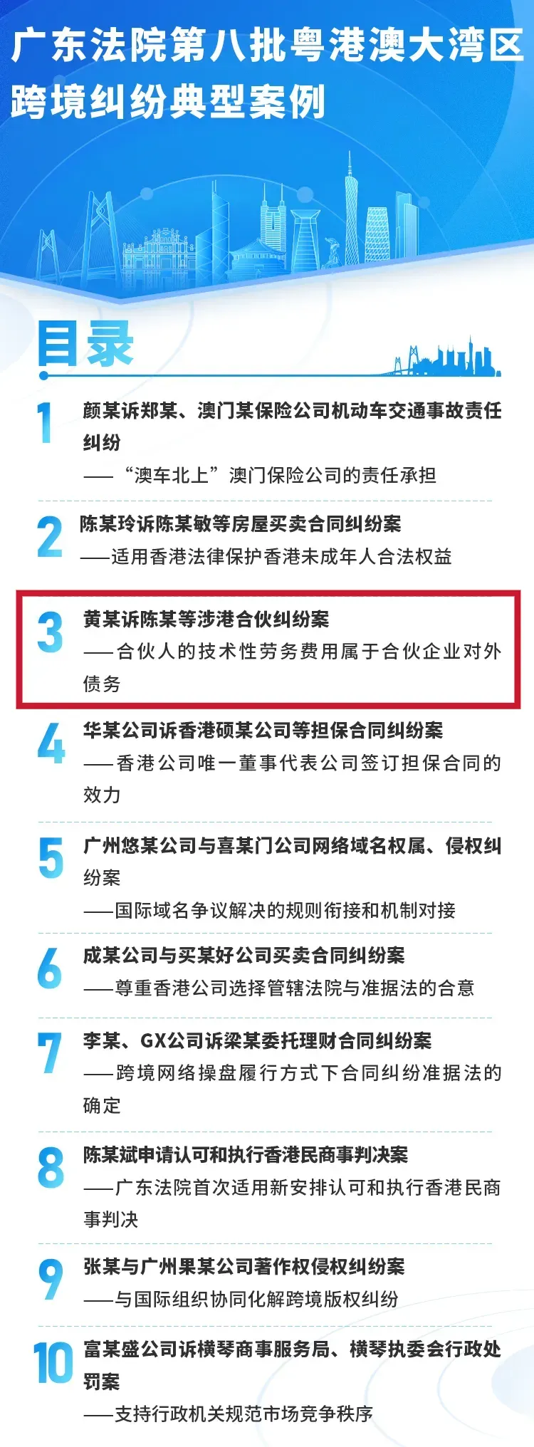 近日,廣東省高級(jí)人民法院發(fā)布第八批粵港澳大灣區(qū)跨境糾紛典型案例,這批案例涉及域外法查明、內(nèi)地法院依據(jù)新安排認(rèn)可和執(zhí)行香港法院民商事判決、香港公司選擇內(nèi)地法院管轄并適用內(nèi)地法律解決糾紛、“澳車北上”保險(xiǎn)責(zé)任承擔(dān)、網(wǎng)絡(luò)域名權(quán)屬等熱點(diǎn)與前沿問題,體現(xiàn)了廣東法院充分發(fā)揮審判職能,全面加強(qiáng)三地訴訟規(guī)則銜接,全力打造跨境糾紛化解優(yōu)選地,為粵港澳大灣區(qū)高質(zhì)量發(fā)展提供有力司法保障的生動(dòng)實(shí)踐。 這十個(gè)典型案例包括交通事故責(zé)任糾紛、房屋買賣合同糾紛、擔(dān)保合同糾紛、著作權(quán)糾紛等多種類型。其中,中山法院審理的黃某訴陳某等涉港合伙糾紛案——合伙人的技術(shù)性勞務(wù)費(fèi)用屬于合伙企業(yè)對(duì)外債務(wù)一案入選,在黃某訴陳某等涉港合伙糾紛案中,內(nèi)地法院依法認(rèn)定香港合伙人的技術(shù)性勞務(wù)費(fèi)用屬于合伙企業(yè)債務(wù),保護(hù)港澳投資者在內(nèi)地的投資權(quán)益,營(yíng)造粵港澳大灣區(qū)法治化營(yíng)商環(huán)境。 據(jù)了解,廣東法院去年共審結(jié)一審涉港澳民商事案件1.35萬件,約占全國的三分之二。自2019年12月至今,已陸續(xù)發(fā)布粵港澳大灣區(qū)跨境糾紛典型案例8批120個(gè),發(fā)揮案例在統(tǒng)一裁判尺度、提供規(guī)則指引、加強(qiáng)法治宣傳等方面的重要作用,以司法之力護(hù)航大灣區(qū)行穩(wěn)致遠(yuǎn)。