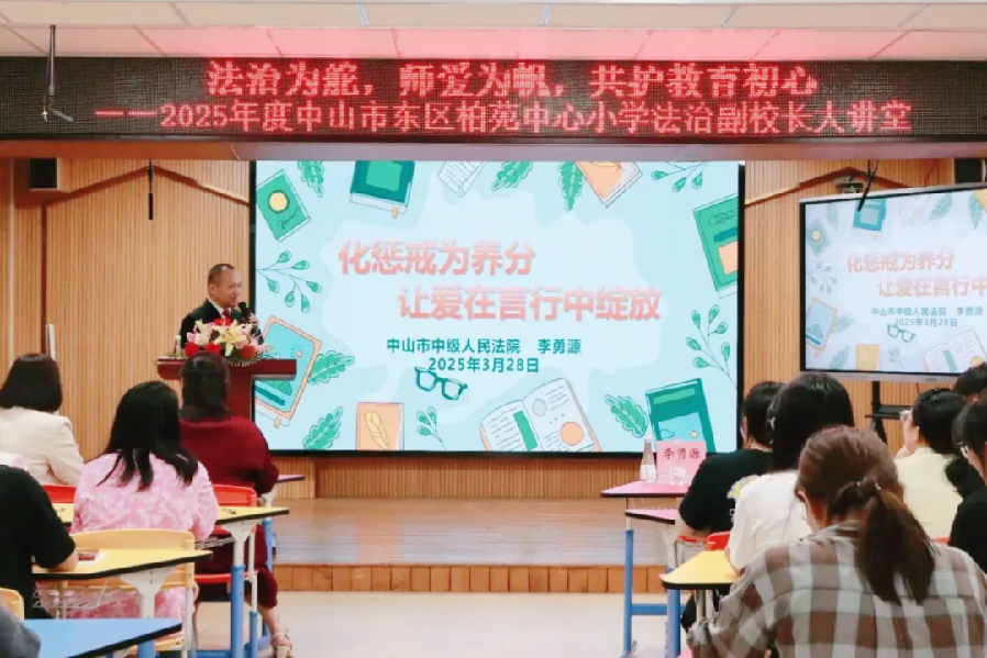 三月的風(fēng)掠過法徽,捎來木棉的絮語,中山兩級法院的法官們褪下法袍、走出法庭,將一堂堂生動的法治課搬進(jìn)了書香氤氳的校園。 市中級法院 在東區(qū)柏苑中心小學(xué),中山市中級人民法院審判監(jiān)督庭庭長李勇源法官作為法治副校長為學(xué)校全體教師開講“法治為舵,師愛為帆,共護(hù)教育初心”的專題法律講座,李法官強(qiáng)調(diào),在孩子成長的畫卷上,愛始終是不變的底色,懲戒既要畫出邊界的線條,也留出綻放的空白,孩子才能身心健康成長。