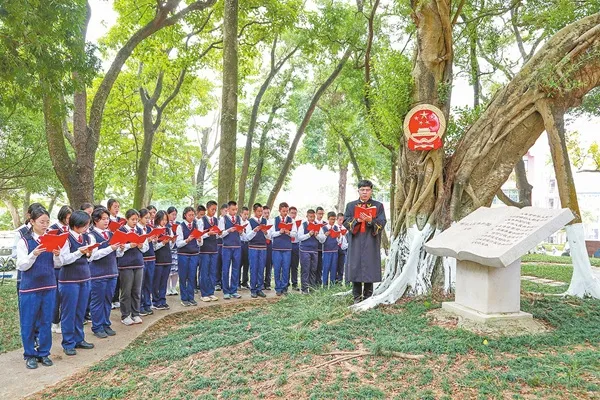 攝 2023年4月,中山第一法院聯(lián)合中山市特殊教育學(xué)校開展“模擬法庭”,12名聽障學(xué)生扮演法官、檢察官、辯護(hù)人,全程用手語“開庭”。 “他們雖然聽不見,但對正義的理解比任何人都深刻?!睂W(xué)校帶隊(duì)老師感慨。 “法槌花開”的背后,是“6﹢1”深度體驗(yàn)?zāi)J降膭?chuàng)新:法治文化體驗(yàn)、法院工作體驗(yàn)、庭審現(xiàn)場體驗(yàn)、互動(dòng)交流體驗(yàn)、法庭角色體驗(yàn)、成長互助體驗(yàn),外加量身定制。“我們根據(jù)學(xué)校需求,量身定制內(nèi)容,比如職校生關(guān)注實(shí)習(xí)權(quán)益,我們就講勞動(dòng)法;高中生關(guān)注電信詐騙,我們就把反詐巡回法庭開進(jìn)校園?!倍∠蚰仍诘谒膶脧V東法治文化節(jié)上分享道。“法槌花開”項(xiàng)目獲評廣東省“誰執(zhí)法誰普法”十大創(chuàng)新創(chuàng)先項(xiàng)目,相關(guān)的普法活動(dòng)已經(jīng)開展325場,覆蓋6萬人次。 壹法宣講團(tuán):流動(dòng)的法槌,家門口的正義 早晨8點(diǎn),中山第一法院“壹法宣講團(tuán)”的法官們已整裝待發(fā),深入開展“人民法官下村居”活動(dòng)。他們背上國徽,在疍家文化和咸水歌發(fā)源地的原生態(tài)漁村新合村開庭和普法。 當(dāng)天,案件當(dāng)事人在法官的主持下,當(dāng)庭達(dá)成調(diào)解協(xié)議,握手言和。這場“露天”法庭吸引了村里40多名村民駐足旁聽。