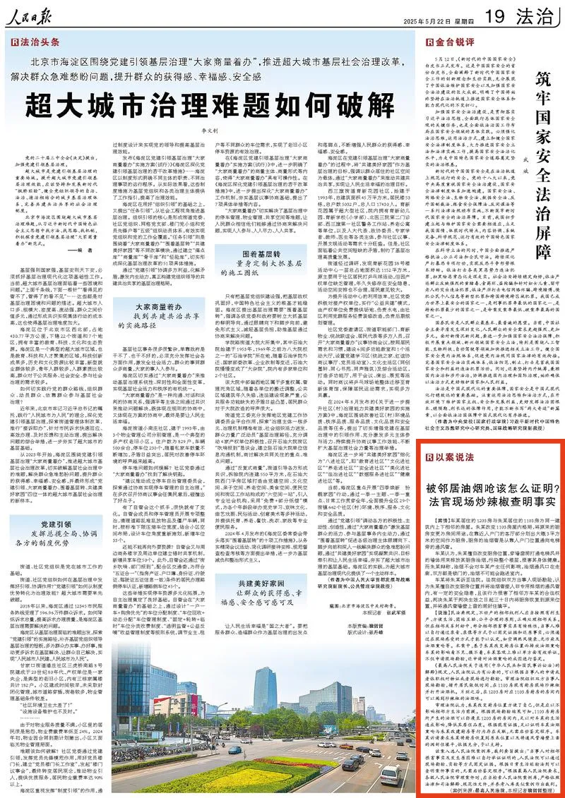編者按 民法典頒布五年來(lái),1260個(gè)條文在千萬(wàn)起司法案件中轉(zhuǎn)化為公平正義的生動(dòng)實(shí)踐,更通過(guò)潛移默化的普法教育形塑著全社會(huì)的價(jià)值理念與規(guī)則意識(shí)。五周年之際,最高人民法院官微開設(shè)“‘典’亮美好生活”專欄,最新一期推出人民日?qǐng)?bào)昨日刊發(fā)的廣州中院審理案件《被鄰居油煙嗆該怎么證明?法官現(xiàn)場(chǎng)炒辣椒查明事實(shí)》。
