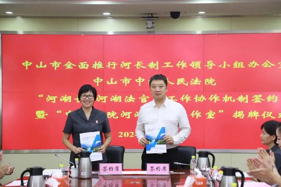 ▲中山市中級人民法院與中山市河長辦舉行《“河湖長+河湖法官”工作協(xié)作機制共建協(xié)議》簽約暨“中山法院河湖法官工作室”揭牌儀式。 四是加強涉水污染行政審判工作,規(guī)范和促進水污染行政執(zhí)法。2022年以來,中山法院環(huán)資審判部門先后派出法官為生態(tài)環(huán)境局及其二級執(zhí)法、技術(shù)機構(gòu)宣講訴訟證據(jù)制度,觀摩指導(dǎo)生態(tài)環(huán)境局下屬檢測流程,邀請行政執(zhí)法機構(gòu)旁聽環(huán)資案件庭審,提高中山涉水環(huán)境行政執(zhí)法、行政審判能力。 五是加強司法建議,得到被建議單位的肯定和積極回應(yīng)。中山中院向中山市生態(tài)環(huán)境局發(fā)出《關(guān)于規(guī)范生態(tài)環(huán)境損害賠償鑒定的司法建議書》,大幅減少事務(wù)性費用,促進賠償義務(wù)人自愿磋商,達成賠償協(xié)議。市第一法院向市生態(tài)環(huán)境局發(fā)出《關(guān)于河涌污染案件辦理的司法建議書》,促進我市有針對性地加大行政執(zhí)法力度,有效防控重金屬嚴重超標工業(yè)廢水污染河涌。 六是加強水污染違法犯罪警示教育宣傳。充分利用世界水日、世界環(huán)境日等節(jié)日,廣泛開展法治宣傳。如市第一法院與最高人民法院、團市委、市水務(wù)局等聯(lián)動在第二個全國生態(tài)日開展